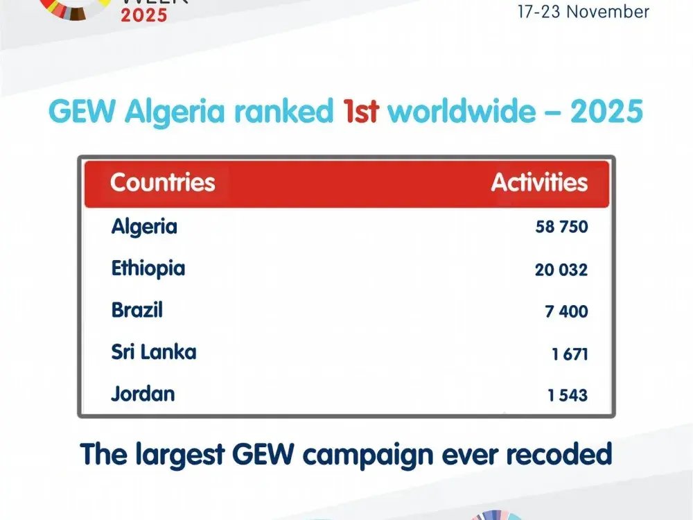 تصدّرت الجزائر المرتبة الأولى عالميًا من حيث عدد الأنشطة المنظمة خلال الطبعة السابعة عشر للأسبوع العالمي للمقاولاتية لعام 2025، وفق ما أعلنت عنه الشبكة العالمية للمقاولاتية "GEN